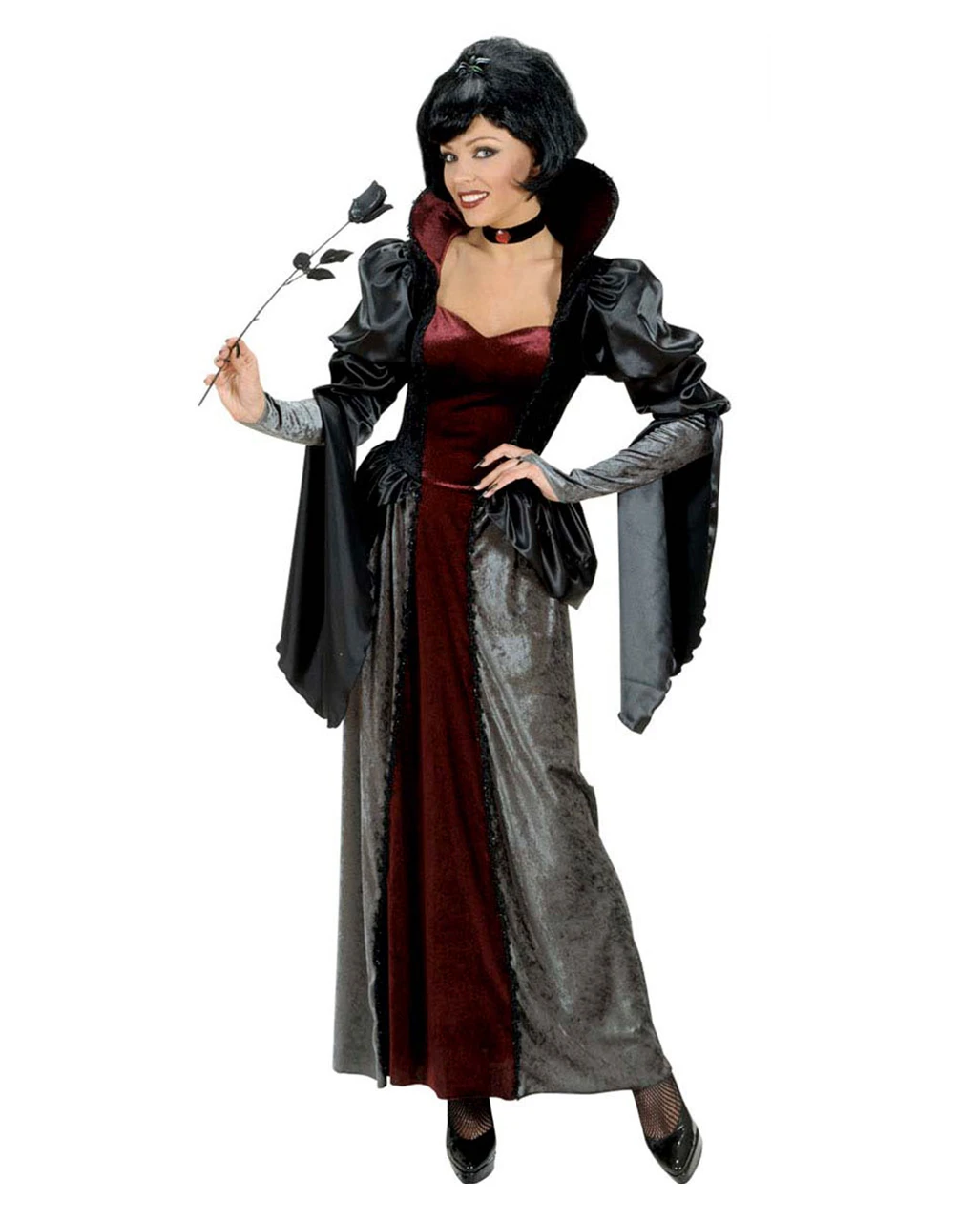 Das dunkle Vampir Königin Kostüm Deluxe ist ein mittelalterliches Samtkleid mit extravagantem Stehkragen und Puffärmeln. Zudem liefern wir dir mit der Blutgräfin Verkleidung ein schwarzes Halsband mit rotem Rubin, was deinen Vampirgräfin Look noch eleganter wirken lässt. Das Halloween Kostüm mit klassischem Schößchen an der Hüfte macht eine tolle Figur und verdreht den Männern den Kopf. Passend dazu haben wir die Spider Queen Perücke & die Scarecrow Lady Fangs Vampir Eckzähne im Sortiment.
