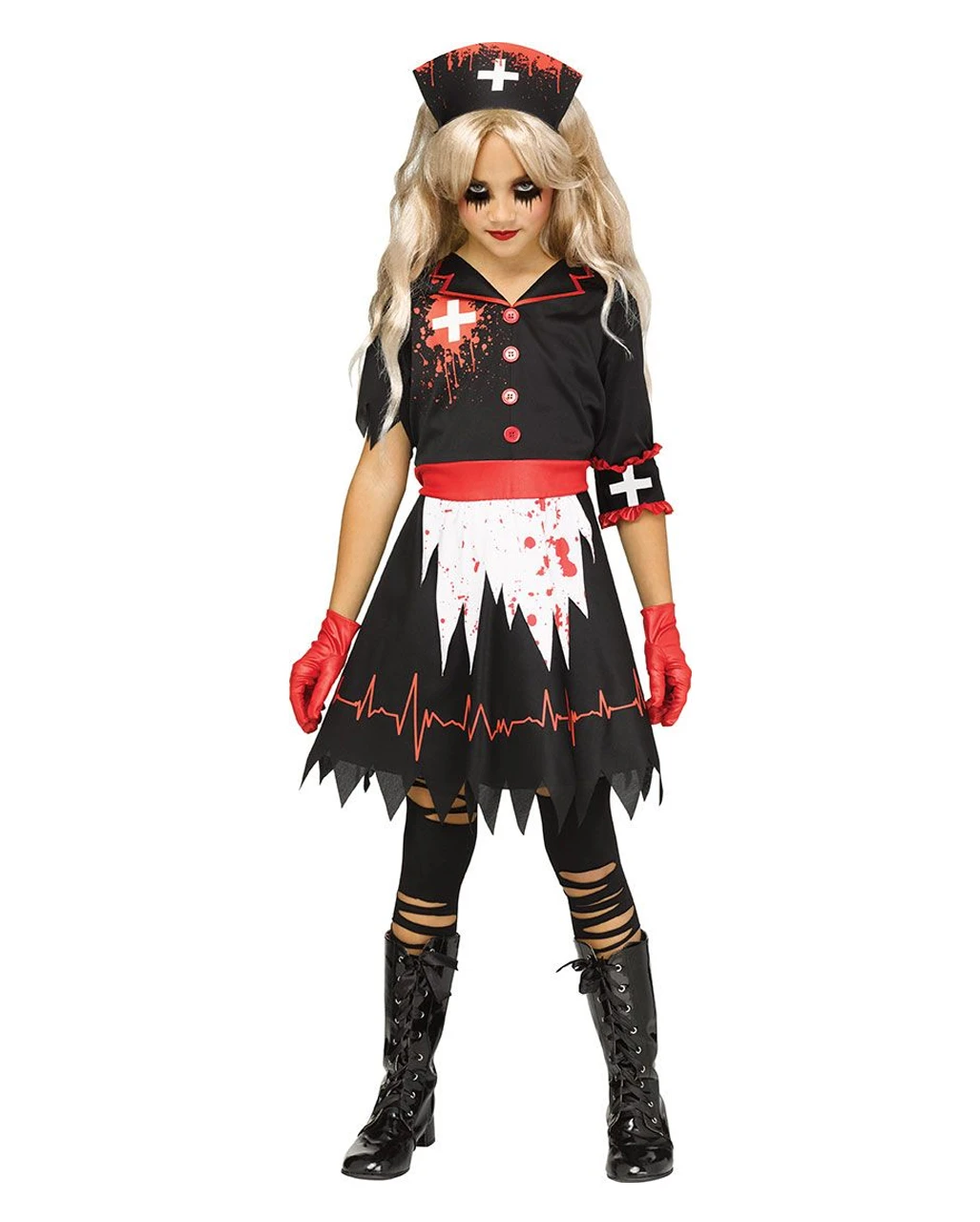 Unser Horror Krankenschwester Kinder Kostüm ist ein geniales Set für junge Gruselfans. Das Kleid des Halloween Kinder Kostüm sieht aus wie eine schwarze Krankenschwestern Tracht. Ein paar geniale Details wie die EKG-Linie über dem Saum, die Blutflecken und die weiße Schürze machen das Halloween Mädchen Kostüm einmal mehr zum Hingucker. Zu der Verkleidung gehören außerdem die roten Handschuhe und der Haarreif mit Schwesternhaube.