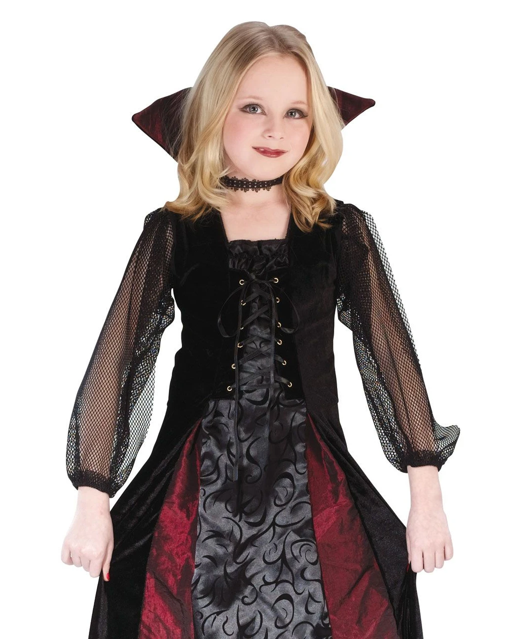 Das feine, bodenlange Halloween Kinderkostüm ist aus schwarz / rotem Satin und Samtstoff gearbeitet, hat feine schwarze Spitzenärmel, ist am Dekolleté zum Schnüren und hat ein Halsband mit Stehkragen. Vampir Eckzähne / Scarecrow Fangs und passendes Night Shadow Gothic Make Up Set findest du bei uns in großer Auswahl. Geniales Halloween Kostüm um damit Halloween die Strassen unsicher zu machen und auf Süßigkeiten Jagd zu gehen.