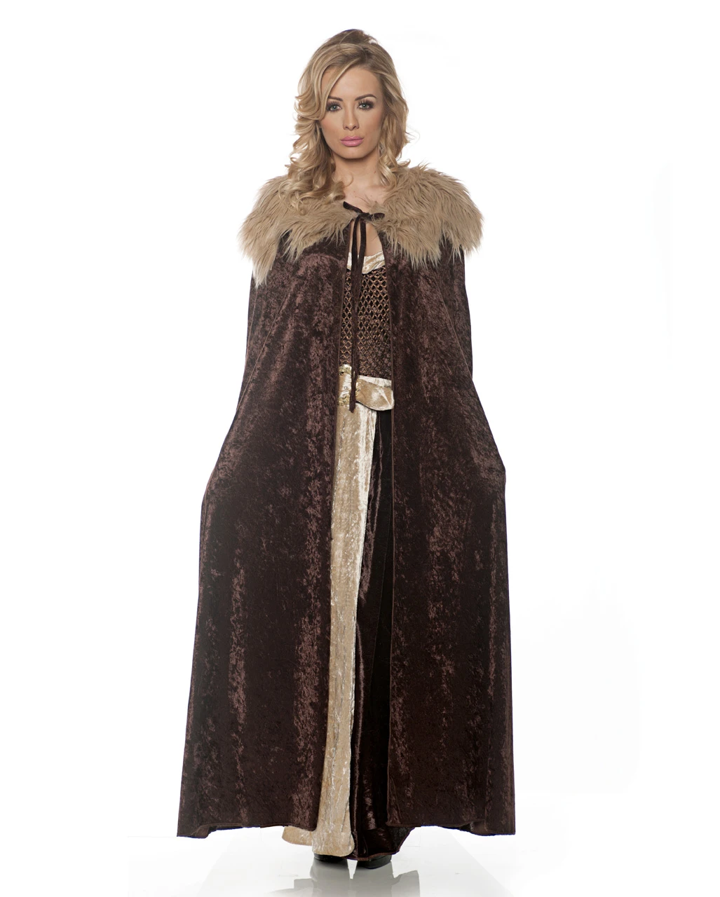 Der braune Mittelalter Kostüm Umhang besticht durch sein schönes Design. Weicher Kunstsamt verleiht dir einen edlen Look und der beige Fellbesatz des Fantasy-Kostümaccessoires sorgt für ein realistisches Aussehen als Kriegerin und Barbarin. Zusammengehalten wird der LARP-Umhang mittels zweier Bänder. Dazu empfehlen wir ein Keltisches Schmuckset Silber und das Sweet Pea Sucker Punch Schwert.