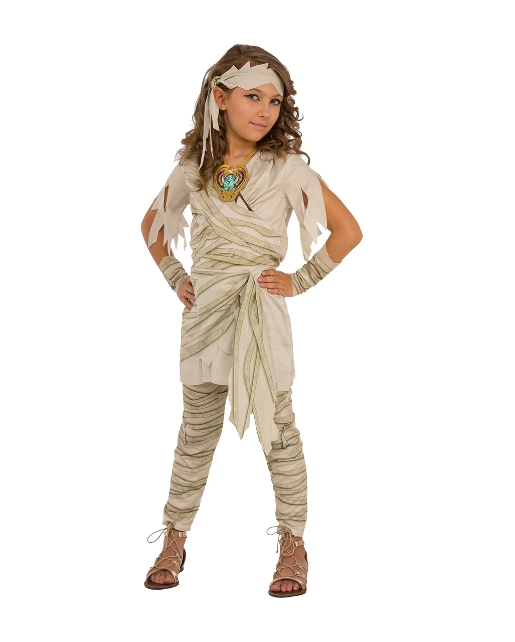 Erschrecke deine Eltern mit dem Prinzessin der Untoten Mumien Kinderkostüm. Das Oberteil und die Hose sehen aus, als würden sie aus beigefarbenen Mumienwickeln bestehen. Ganz stilecht trägst du auch die Armstulpen im Wickel-Stil. Das Kopfband komplettiert den untoten Wickel-Look des Halloween Kinder Kostüms. Die wertvoll aussehende Kette allein zeugt davon, dass du eine echte ägyptische Prinzessin gewesen bist.