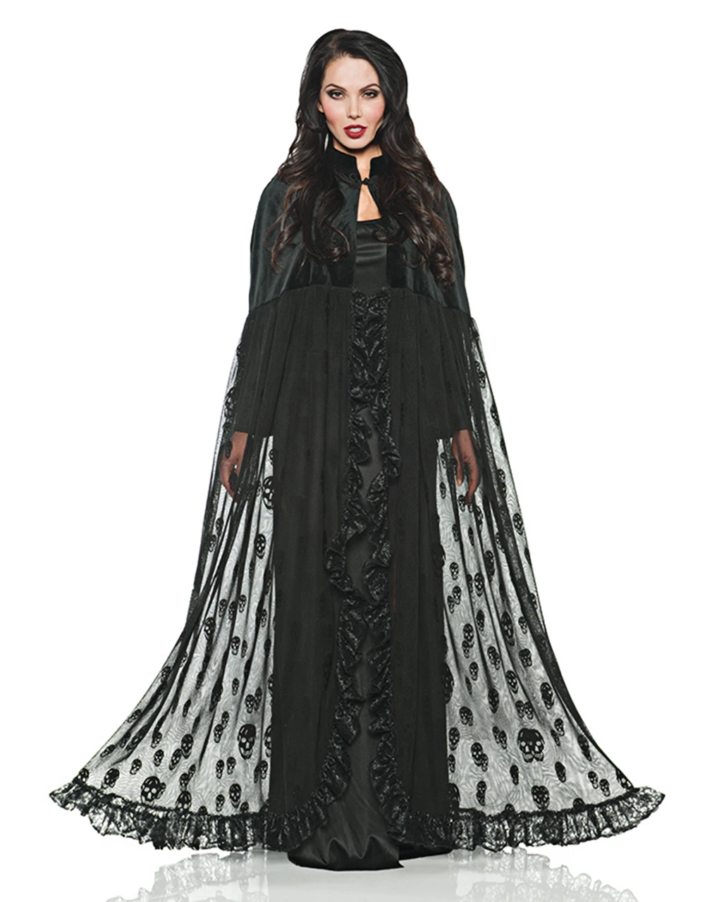 Das schwarze Samt und Spitzen Skull Cape ist ein edler langer Umhang für zahlreiche Halloween Kostüme. Der Gothic Kostüm Umhang eignet sich ideal als schwarzes Mode Accessoires, Vampir Verkleidungen & Witwen Kostüme an Halloween & Gotik Festivals.