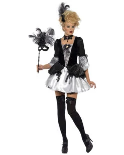 Das sexy Barock Fee Kostüm ist ein wunderbares Frauengewand, ein Minikleid, das im barocken Stil aus hochwertigem, schwarzem und silbernem Satin ähnlichem Stoff gefertigt wurde. Als Dekoration hat das sexy Kostüm feine, silberne Einsätze mit einer Spitzen-Schleife am Oberteil und schwarze Ärmel, die in silbernen Trompetenärmeln enden. Zusätzlich dienen an diesen Trompetenärmeln hübsche Spitzeneinsätze als Dekoration. Dem kurzen, silbernen Rock sind zwei schwarze Schößchen angenäht, die mit schwarzen Spitzen-Schleifen geschmückt wurden. Dein sexy Barock Lady Outfit wird aber erst durch eine Marie Antoinette Perücke weißblond und eine Venezianische Jester Maske dunkelblau komplett.