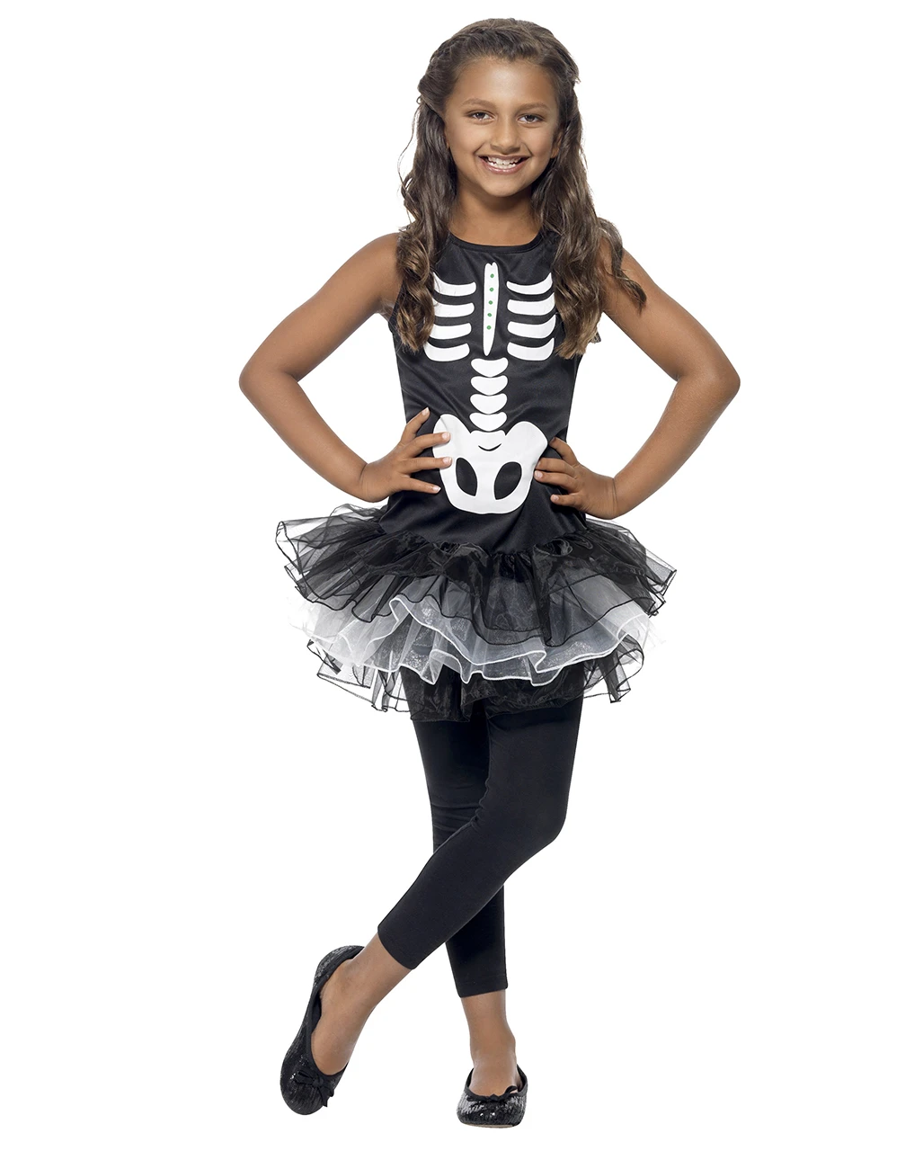 Das Skelett Ballerina Kinderkostüm besteht aus einem schwarzen Kleid mit schwarz-weißem Tutu aus Tüll. Auf der Vorderseite des Kleides ist ein weißer Skelett Oberkörper aufgedruckt. Kombiniere das Kostüm deines Kindes mit dem Family Skelett Make Up Set und der Kinder Leggings schwarz.