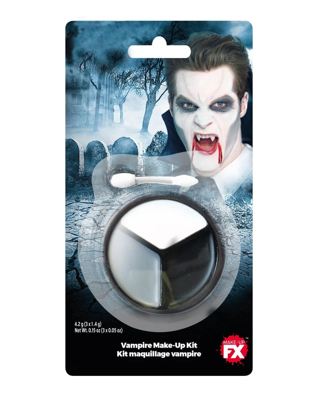 Das 4-teilige Vampir Make-up besteht aus Creme Make-up und den Schminkfarben Weiß, Grau und Schwarz. Mit der weißen Schminke lässt sich die Grundierung vorbereiten, während mit Grau und Schwarz die Schattierungen geschminkt werden können. Der beiliegende Schmink-Applikator aus Schaumstoff hilft die beim Auftragen des preisgünstigen Vampir Make-up. Zum Auftragen des Make-Ups empfehlen wir dir den Schminkschwamm und den Schmink Pinsel Nylon No 16.
